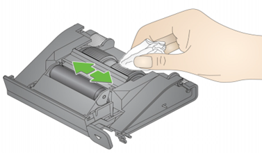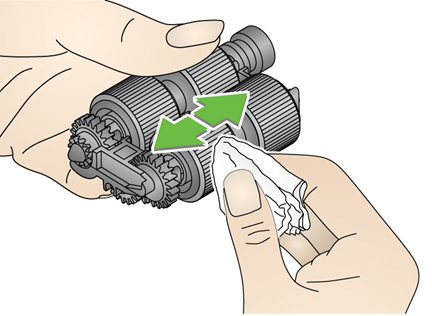 • درصورتی که وضعیت ظاهری رولرهای کشنده کاغذ از لحاظ خوردگی قابل قبول میباشد نسبت به تمیز نمودن رولرها به وسیله دستمال تنزیف مرطوب شده با اسپری کنتاکت شور خشک، مطابق شکل اقدام نمایید