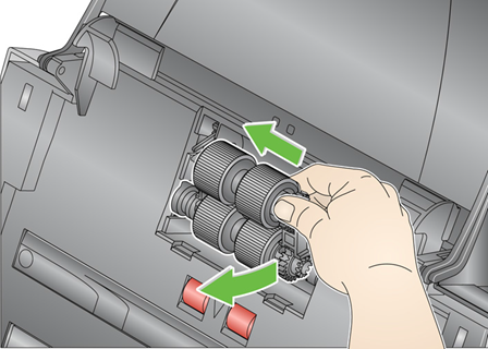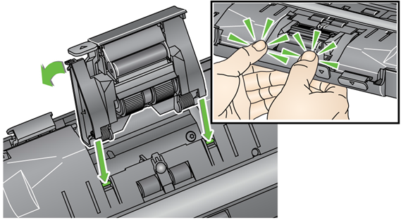 • مطابق شکل زیر ماژول جداکننده کاغذ را در آورده و نسبت به تمیز نمودن رولر های طوسی رنگ اقدام نمایید